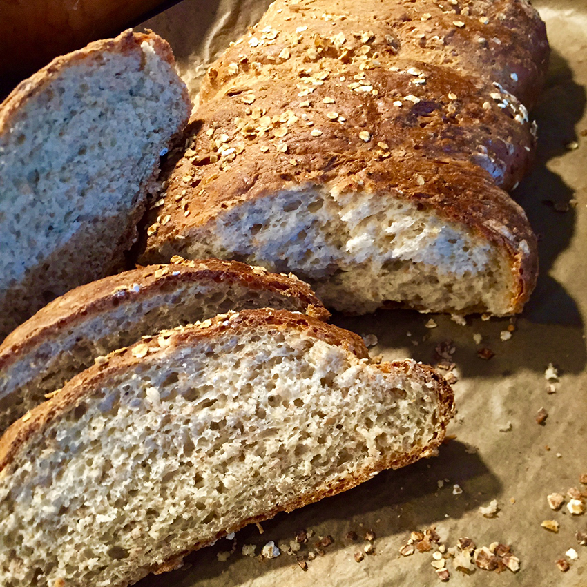 Alle Zutaten miteinander verkneten, mit Mehl bestäuben und eine Stunde abgedeckt gehen lassen. Nochmals durchkneten, Brotlaib formen, mit Haferflocken bestreuen, auf dem Backblech nochmals abgedeckt 30 Minuten gehen lassen. Bei 190°C Umluft ca. 40 Minuten backen.