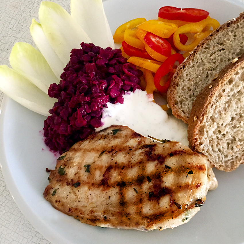 und dann gegrillt mit etwas Creme Fraiche, buntem Spitzpaprika und vielleicht etwas vom roten Linsen Salat serviert: