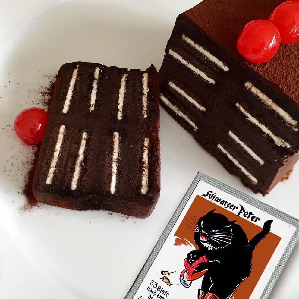 Milch mit Espresso und Butter aufkochen, vom Herd nehmen und die Schokolade darin schmelzen lassen. Kakao unterrühren. Etwas abkühlen lassen. Inzwischen eine Kastenform mit Backpapier auslegen. Abwechselnd Schokolade und Kekse in die Form schichten. Mit Schokolade beginnen und enden. Abgedeckt mindestens 5 Stunden kühlen. Stürzen, Backpapier entfernen, mit Kakao bestäuben und mit Cocktailkirschen garnieren – und maximal ein halbes Stück davon essen.