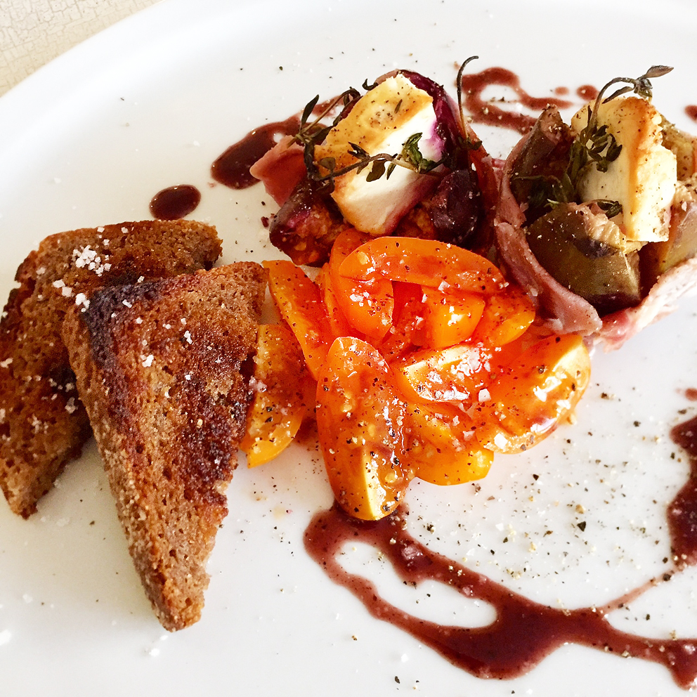 … dazu in Olivenöl gebratenes Dinkelbrot mit Fleur de Sel. Die Sauce ist eine Reduktion aus dem Feigensaft, der beim Backen ausgetreten ist, gleicher Menge Portwein, etwas frischem Thymian, schwarzem Pfeffer sowie zum Abschmecken einem Esslöffel Balsamico-Essig.