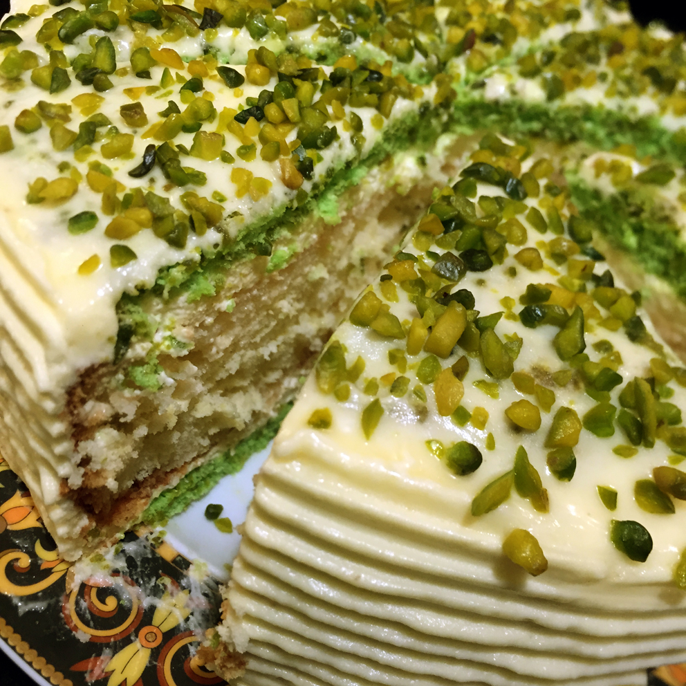 Ich bin ja seit längerem auf der Suche nach dem perfekten Zitronenkuchen. Hier ist ein weiterer Versuch – nochmals auf Basis der Zuger Kirschtorte mit Japonais Böden, getränkter Biskuit-Füllung, einer Tränke aus Zitronensirup sowie weisse Ganache statt Puderzucker und Pistazien statt Mandeln. Überzeugt mich noch nicht …