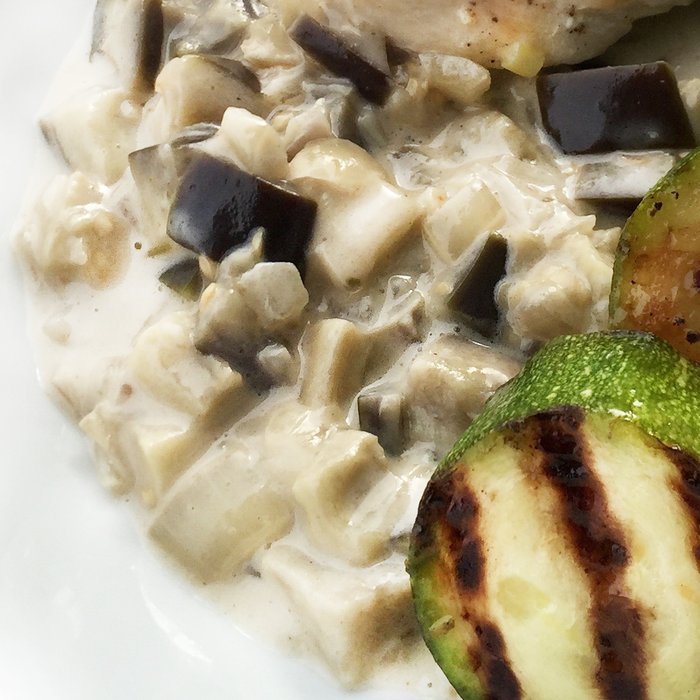 Alle Zutaten bis und mit Koriander rüsten, kleinschneiden und mit der Butter in der Küchenmaschine pürieren. Rahm und Kokosmilch erhitzen, Buttermischung zugeben, aufkochen, 10 Minuten köcheln lassen, mit Salz und schwarzem Pfeffer aus der Mühle abschmecken. Durch ein Sieb passieren und beiseite stellen. Schalotten in Würfel schneiden und glasig dünsten, währenddessen die Auberginen ebenfalls würfeln, zugeben, mit der Curry Sauce aufgiessen, aufkochen, Hitze wegnehmen und ziehen lassen. Dazu gegrillte Zucchini