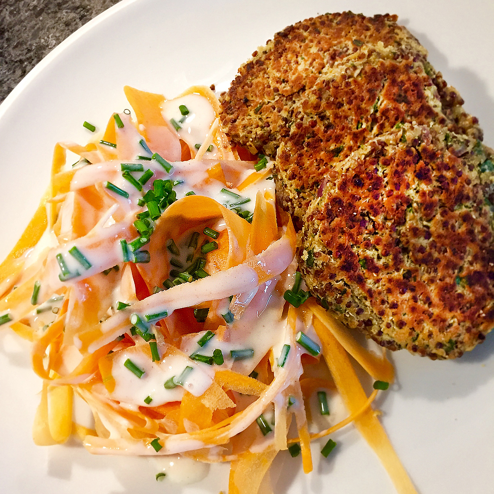 Inspiriert von Evas Blog http://vegan-century.com/ – danke Eva! Quinoa abspülen und in 300 ml gesalzenem Wasser offen kochen, dann die Hitze abschalten und auf der Platte abgedeckt quellen lassen, bis das Wasser vollständig aufgesogen wurde. Inzwischen Zwiebeln schälen, würfeln und in etwas Sonnenblumenöl glasig dünsten. Nun alle Zutaten zu einer festen Masse verkneten, jeweils einen guten Esslöffel der Masse in heissem Olivenöl von jeder Seite ca. 4 Minuten goldbraun braten. Für den Salat die Karotten schälen und weiter mit dem Sparschäler in dünne, breite Streifen schneiden. Zutaten fürs Dressing miteinander verrühren und über die Karottenstreifen geben.