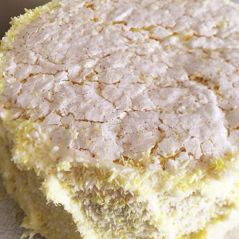 Fertigstellen: Biskuitboden noch warm und in der Form mit einem Holzspiesschen einstechen und mit der Hälfte der Tränke tränken. In der Form auskühlen lassen. Dann auf einem Japonais-Boden ein Viertel Panna Cotta streichen, darauf den Biskuit mit der getränkten Seite nach unten legen, diesen nochmals mit dem Rest des Zitronensirups tränken, das zweite Viertel Panna cotta aufstreichen und den zweiten Japonaisboden oben auf legen. Mit dem Rest Panna Cotta den Kuchen rundum bestreichen, Oberfläche glatt streichen, Rand mit Kokosflocken bestreuen. Kuchen über Nacht kalt stellen.