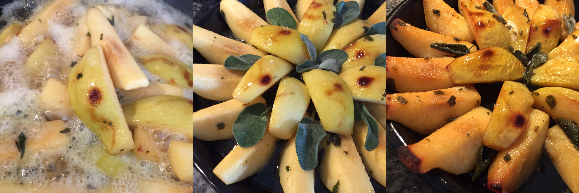 Salbei-Quitten: Quitten heiß waschen und pelzige Oberfläche abreiben, dann längs sechsteln und Kerngehäuse großzügig herausschneiden. Butter mit ein paar klein geschnittenen Salbeiblättern aufschäumen, die Quittenscheiben darin anschwenken, Honig zugeben und karamellisieren lassen. Mit Muskatwein ablöschen, Fleur de Sel zugeben und aufkochen. Im Ofen bei 190°C 34 Minuten fertig garen. Mit Salbei garnieren.