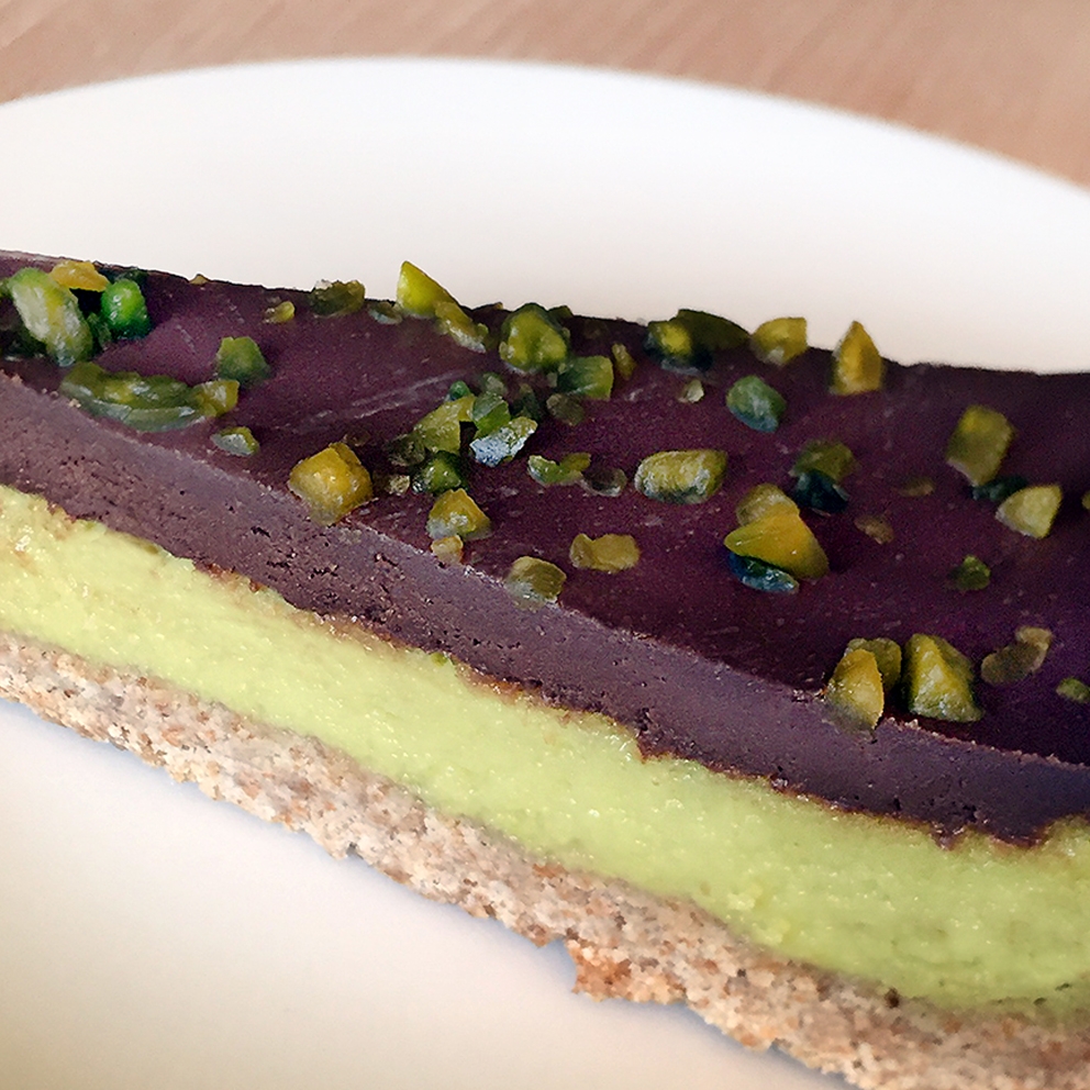 Mürbeteig herstellen aus den ersten 3 Zutaten und 30 Minuten kalt stellen. Ofen auf 180 °C Umluft vorheizen. Eine Tarteform Ø 27 cm mit dem Mürbeteig belegen. Restliche Zutaten bis und mit Avocado pürieren, auf den Kuchenboden giessen und 40 Minuten backen. Inzwischen Sojamilch aufkochen, vom Herd nehmen und die Schokolade darin schmelzen lassen, glatt rühren, auf die Tarte giessen und mit Pistazien bestreuen. Über Nach im Kühlschrank fest werden lassen.