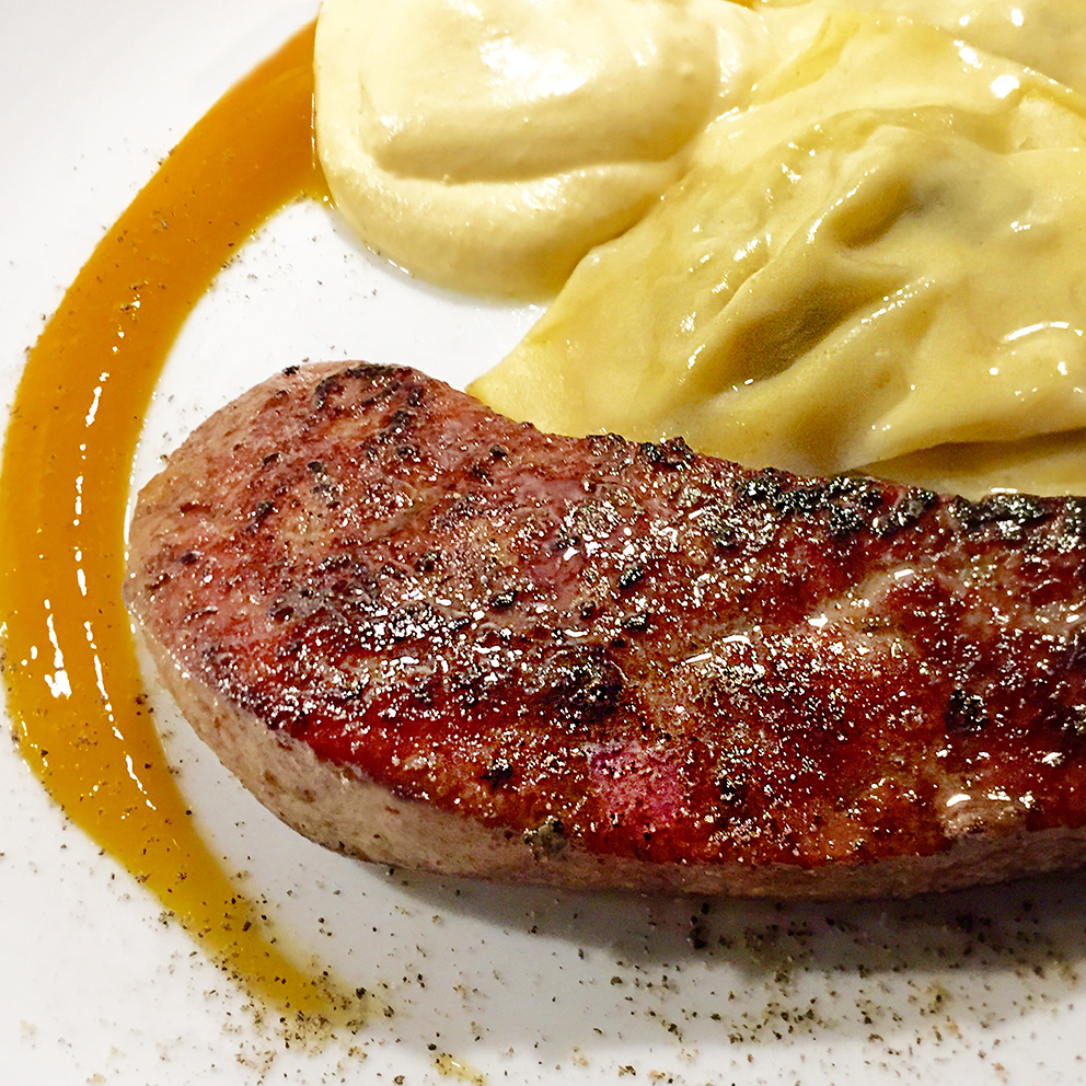 Rahm steif schlagen, Aprikosen pürieren und darunter mischen, 2 EL Püree zum Garnieren zurückbehalten, kalt stellen. Pilze, Knoblauch und Pastinake fein würfeln. Pastinake in Olivenöl anbraten, Pilze und Knoblauch zugeben, mit Salz, Thymian und Pfeffer würzen und durchschwenken, vom Herd nehmen und auskühlen lassen. Eier und Creme Fraiche vermischen und mit dem Pinsel ein Gitter auf den Nudelteig „malen“. Füllung mit der restlichen Eiermasse mischen und haselnussgrosse Stücke auf den Nudelteig verteilen. Zweiten Teig darüber legen, Ränder andrücken, Ravioli ausschneiden und diese in heissem Wasser 3 Minuten ziehen lassen. Inzwischen die Lebertranchen trocken tupfen, mit Salz und Pfeffer würzen, in Mehl wenden und in Butter sanft ausbraten.