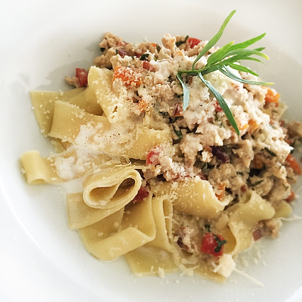 Karotten schälen und in kleine Würfel schneiden, 10 Minuten blanchieren, abschrecken und beiseite stellen. Knoblauch mit Senf, Salz und Olivenöl in der Küchenmaschine pürieren, zum Hackfleisch geben und bei mittlerer Hitze ohne Farbe anbraten bis das Fleisch krümelig wird. Mit dem Zitronensaft ablöschen, redzieren, mit Rahm aufgiessen und aufkochen. Hitze abschalten, geschnittenen Estragon und Zitronenabrieb zugeben, mit Pfeffer abschmecken.
