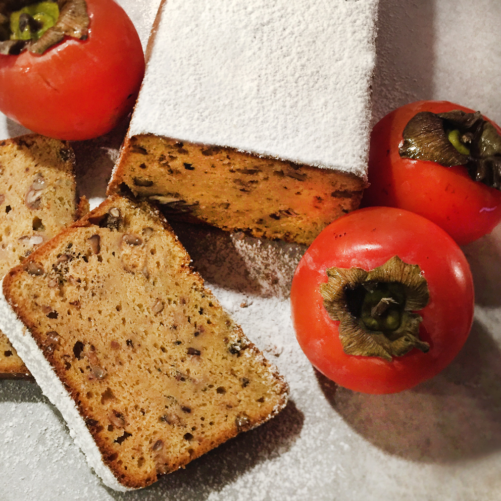 Kastenform von 30 cm Länge buttern und mehlen, Ofen auf 180ºC Ober- Unterhitze vorheizen. Trockene Zutaten vermischen. Das Fruchtfleisch der Kakis pürieren, mit Eiern, Gewürzen und Scotch verrühren. Zur Mehlmischung geben und kräftig aufschlagen bis eine sämig-cremige Masse entsteht. Dann die flüssige Butter in dünnem Strahl zugeben, dabei weiter schlagen. Zum Schluss die gerösteten Pekanüsse unterrühren. Teig in die Backform geben und auf der unteren Schien 1 Stunde backen.