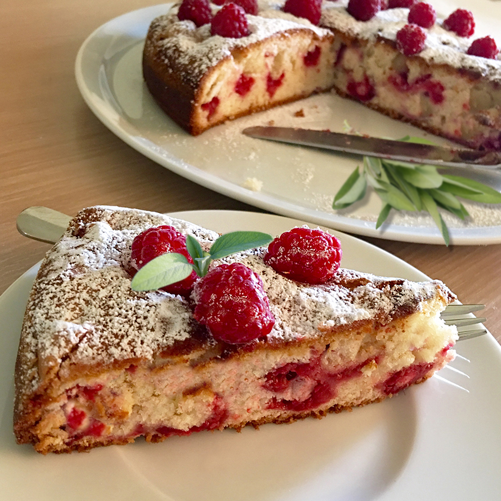 Eier mit Sirup, Zucker und Salz schaumig schlagen, Mehl unterrühren und zum Schluss vorsichtig die Himbeeren (ein paar zurückbehalten). Springform buttern und mit Semmelbrösel ausstreuen, Teig einfüllen und glatt streichen. Butter-Flöckchen darauf verteilen und leicht in den Teig drücken. Bei 175 Grad Umluft auf der unteren Schiene ca. 35 Minuten backen. Auskühlen lassen, in die Vertiefungen welche die Butter hinterlassen hat, die restlichen Himbeeren setzen, alles mit Puderzucker bestäuben und mit einem frischen Salbei-Zweig garniert servieren.