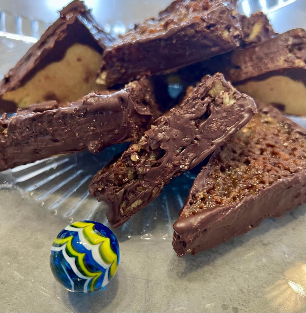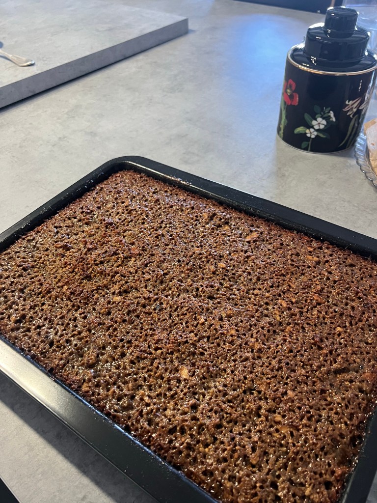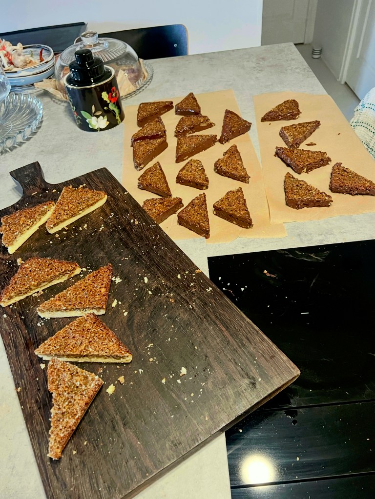 Orangenabrieb und Mehl unterheben. Teig auf einem Backblech (30 x 40 cm) ca. 1,5 cm hoch glatt streichen, mit Orangenmarmelade bestreichen. Für den Belag Butter, Zucker und Orangensaft erhitzen, bis sich der Zucker aufgelöst hat, Nüsse zugeben und verrühren. Die Masse auf den Teigboden geben und glatt streichen. Auf der mittleren Schiene bei 175 Grad Ober- Unterhitze 35 Minuten backen. Vollständig abkühlen lassen, dann schneiden und mit einem Backpinsel die Ränder mit geschmolzener Kuvertüre bestreichen.