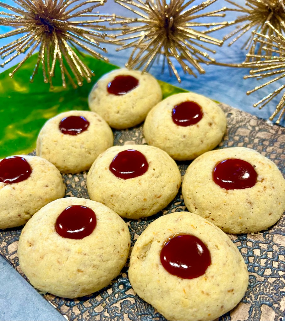 Zutaten bis auf Marmelade rasch zu einem geschmeidigen Teig verkneten. Eine Stunde kalt stellen, dann 20 Kugeln (je ca 30g) formen, mit Abstand auf ein Backblech legen, mit einem Holzlöffelstiel jeweils ein Loch in die Mitte jeder Kugel drücken und 20 Minuten ins Gefrierfach stellen. Gefrorene Teiglinge mit Hagebuttenmarmelade füllen. Bei 170 Grad Ober-Unterhitze ca. 20 Minuten backen. Aus dem Ofen nehmen, mit der restlichen Marmelade füllen und auskühlen lassen.