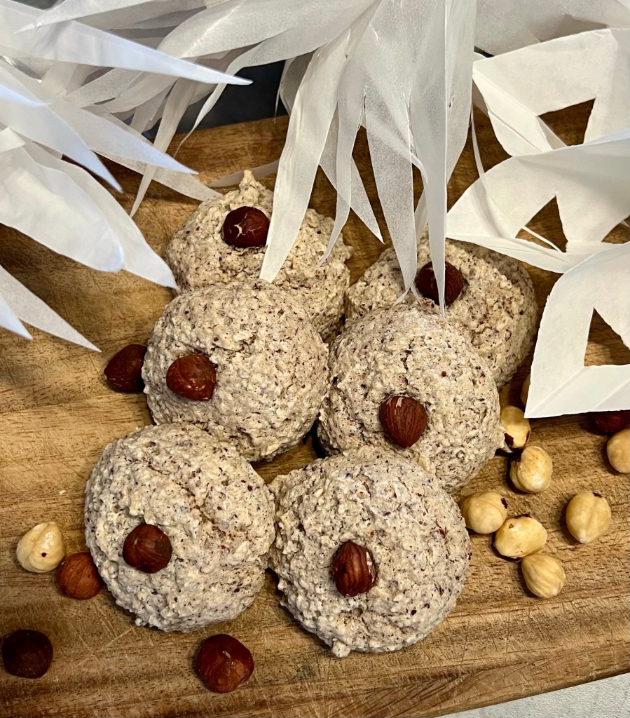 Eiweiß mit den Zutaten bis und mit Salz über dem Wasserbad aufschlagen. Gemahlene Haselnüsse und Mehl mischen und unter den Eischnee heben. Mit dem Eisportionierer Kugeln formen und auf ein mit Backpapier belegtes Blech geben. Jede Makrone mit einer ganzen ungeschälten Haselnuss garnieren. Bei 150 Grad Ober-Unterhitze 25 Minuten backen. Zum Auskühlen vom Blech nehmen.