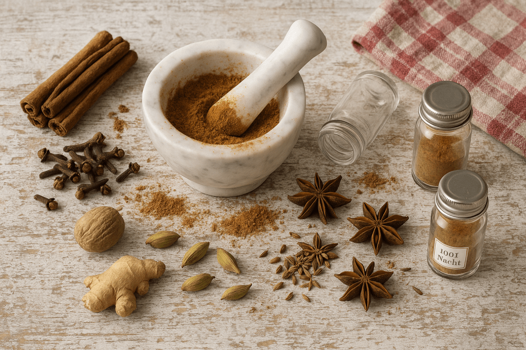 Die 1001 Nacht Gewürzmischung stellt man ganz einfach selbst her, sie eignet sich auch zum Aromatisieren anderer Weihnachtsbäckerei: 2 geh. Teelöffel gemahlenen Zimt, je 1 geh. Tl gemahlenen Kardamom und Ingwer sowie eine Messerspitze geriebene Muskatnuss vermischen. 4 Nelken, 4 Pimentkörner, 1 Sternanis und 1 geh. TI Anissamen in der Gewürzmühle mahlen oder mörsern, mit der anderen Gewürzmischung mischen und in ein lufdichtes Behältnis z.B. ein kleines Schraubglas umfüllen.