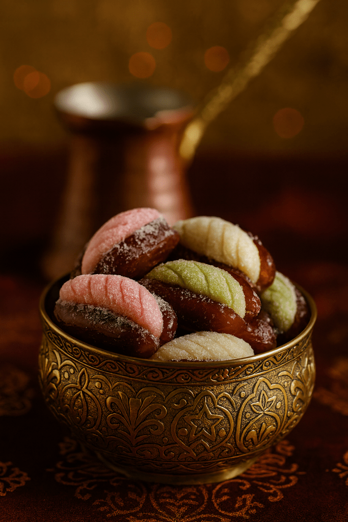 So geht’s: Datteln in der Mitte halbieren, den Kern entfernen und mit Marzipan füllen. Schokolade im heißen Wasserbad schmelzen. Marzipandatteln nacheinander in die Schokolade tunken und auf ein Backpapier setzen. Mit Goldpulver bestäuben und trocknen lassen.